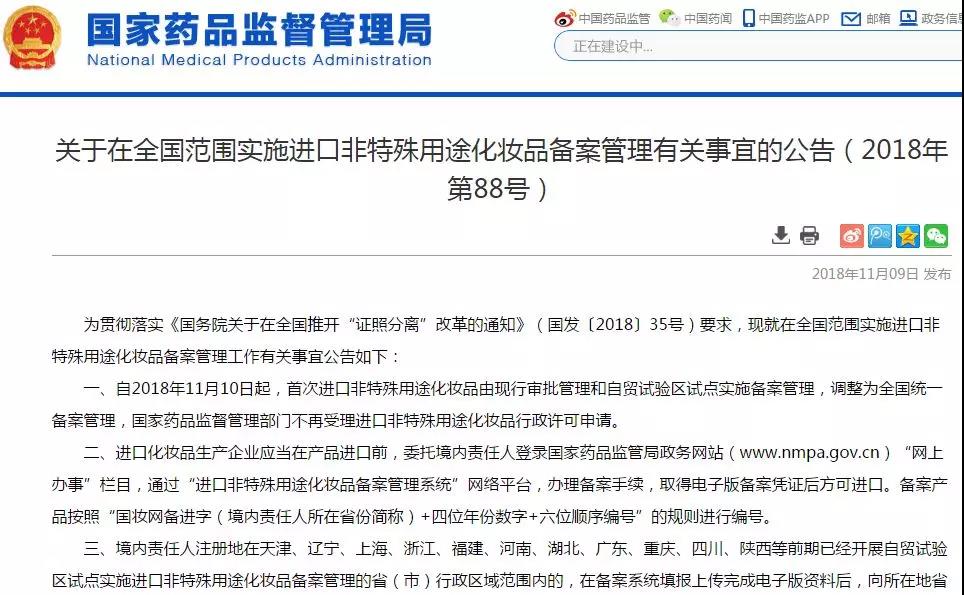 重磅!全國范圍實施進口非特殊化妝品備案管理(2018年第88號)